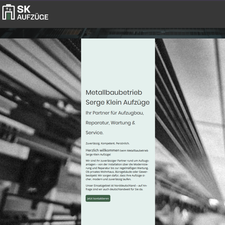 Für den Metallbaubetrieb SK-Aufzüge haben wir die Website von Grund auf eingerichtet – inklusive Domain, E-Mail und Hosting. Nach der Ersteinrichtung gab es eine kurze Schulung, sodass Serge und Julia nun Inhalte eigenständig pflegen können.